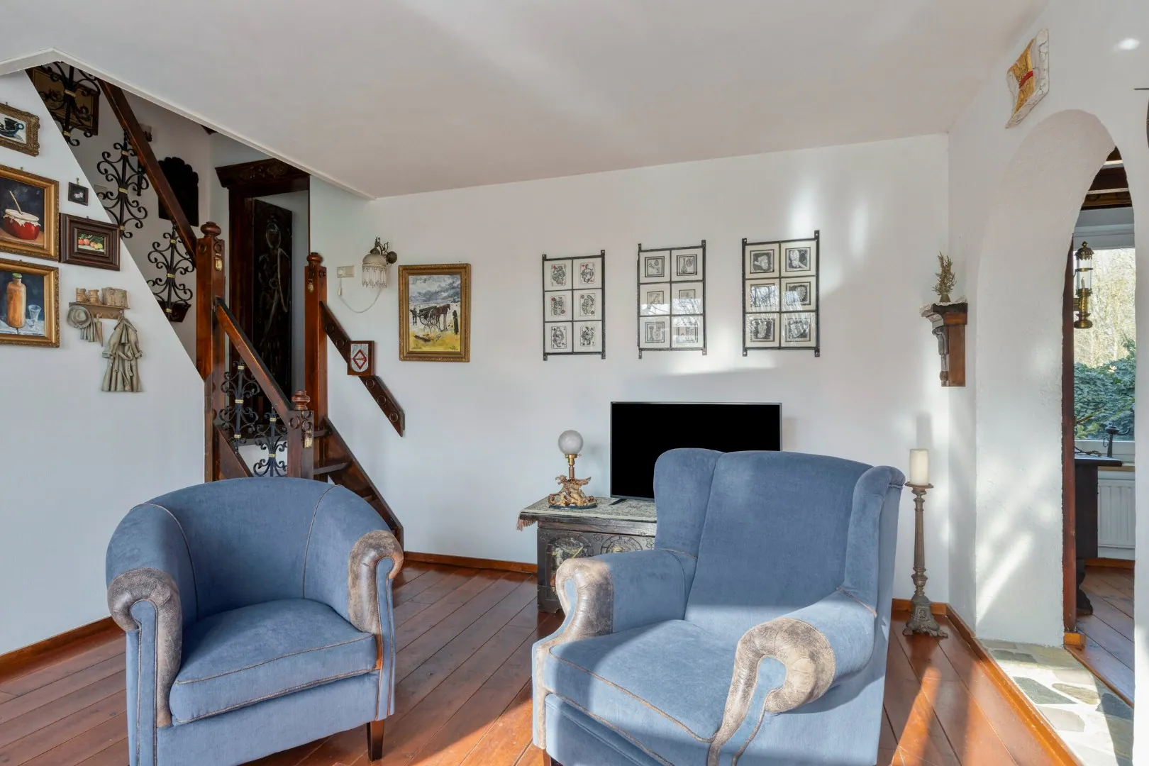 Vanuit de entree met meterkast en watermeter, toegang tot lichte woonkamer met (sier) haard en doorgang naar de eetkamer.