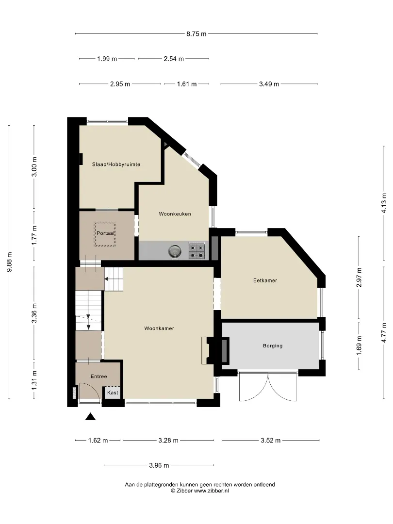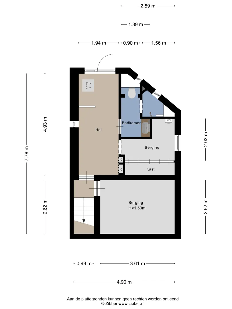 vanaf de entree bereikbaar via trap naar beneden . Rechts van de trap bevindt zich onder de woonkamer een berging met beperkte hoogte.