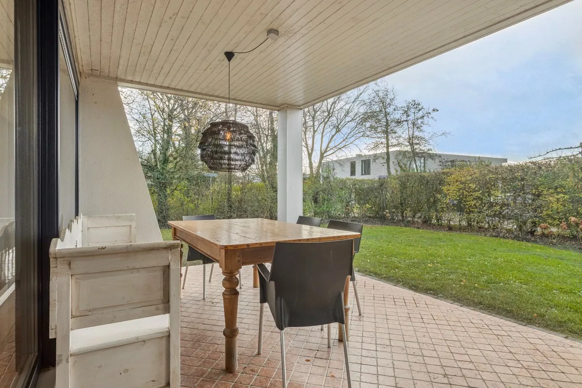 Aangrenzend is de eetkamer met toegang tot het overdekte terras (gelegen op het zuidwesten) en royale tuin rondom.