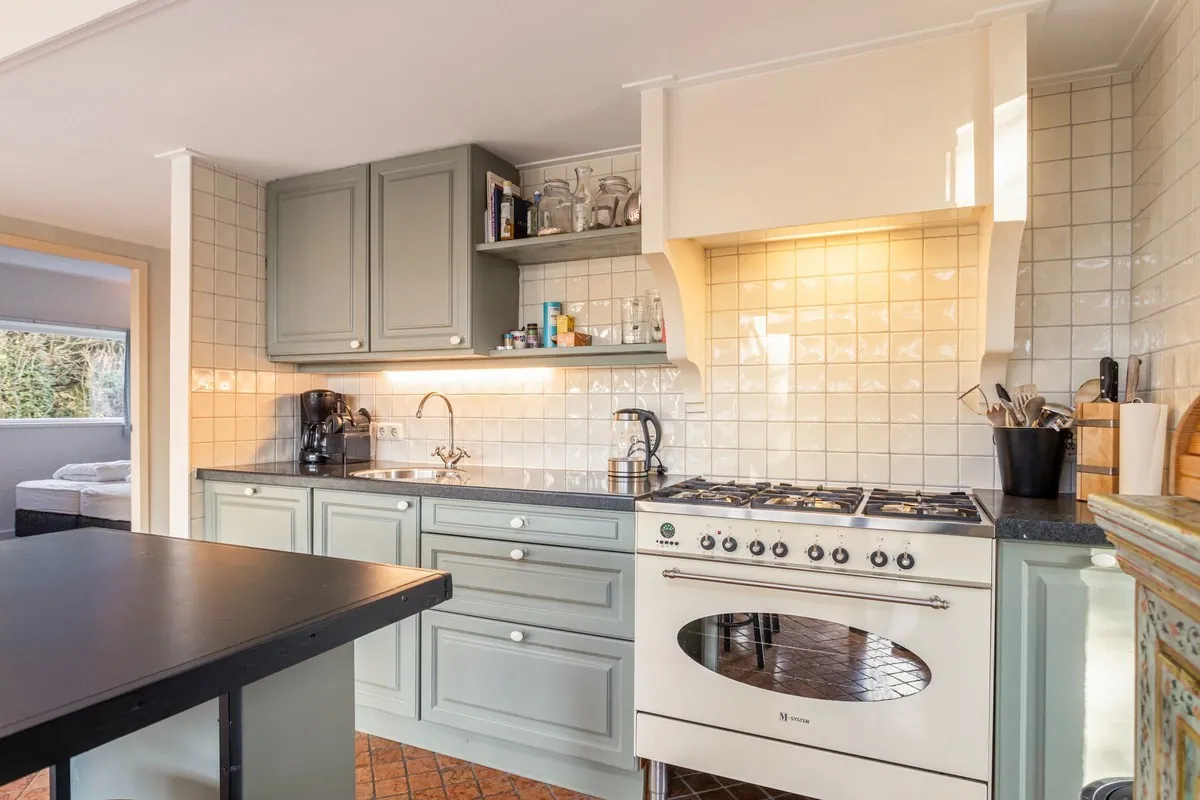 Toegang tot een royale woonkeuken/ centrale ruimte met sfeervolle landelijke keukeninrichting voorzien van: 6-pits gasfornuis (90cm), afzuigschouw, koel-vriescombinatie, magnetron en vaatwasser.