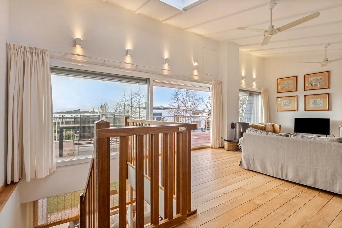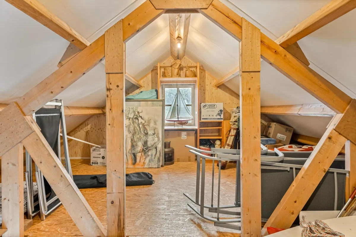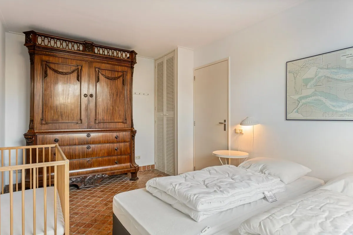 Middels vaste trap te bereiken royaal bemeten lichte woonkamer (ca. 50 m2) voorzien van o.a. massief eikenhouten vloer en houtkachel. 2 slaapkamers afm. ca. 11 m2. Vanuit de woonkamer middels schuifpui te bereiken dakterras (ca. 32m2/ gelegen op het zuidwesten) waar het heerlijk toeven is met natuurlijk het magistrale uitzicht naar Veere.
