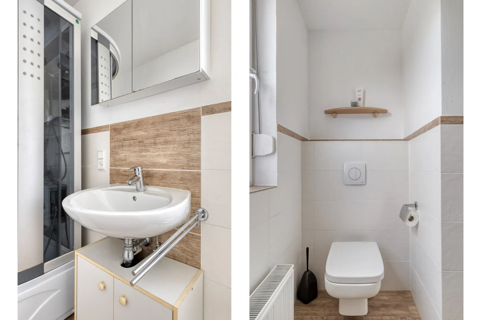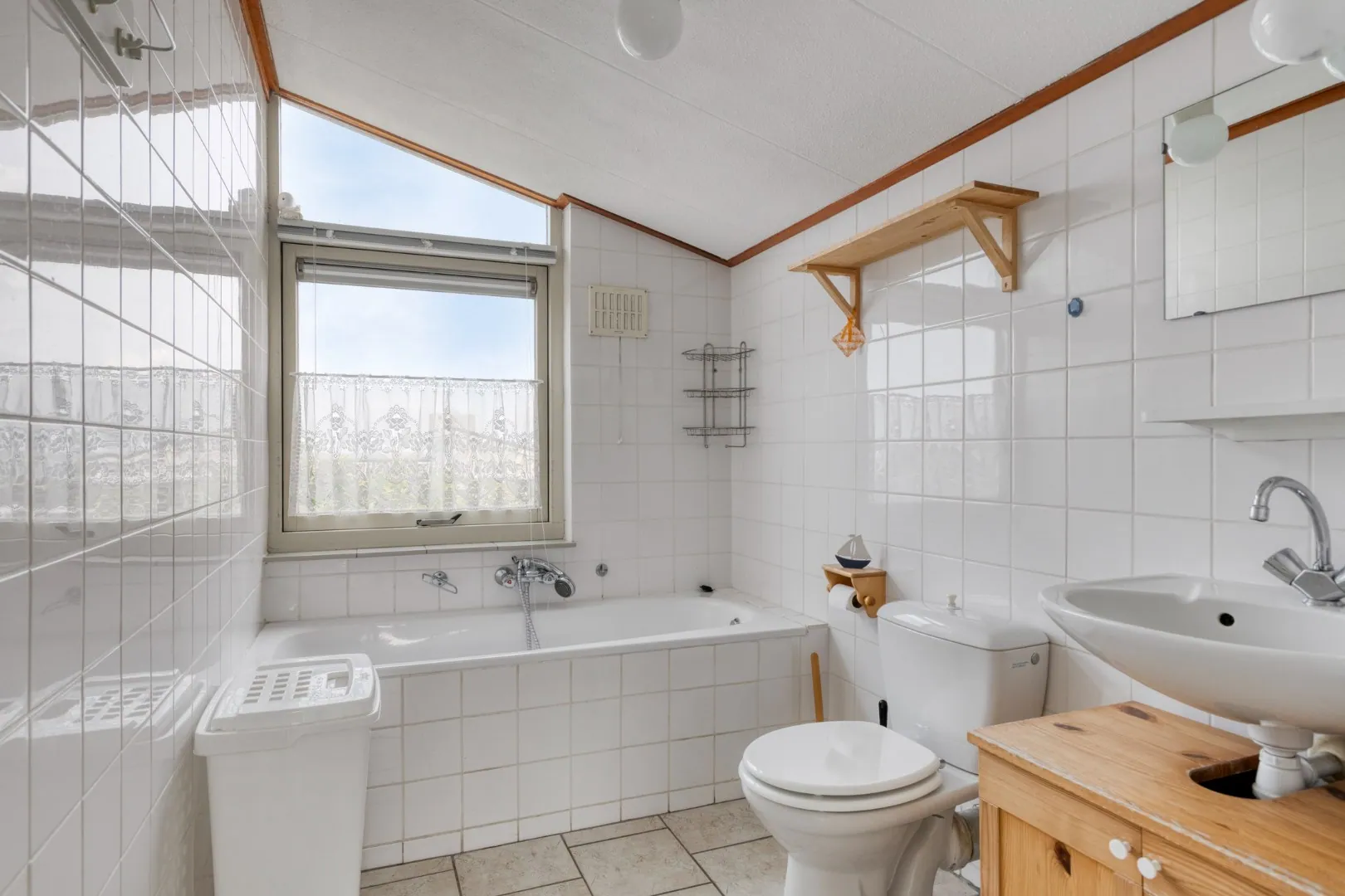 Overloop met toegang tot een 2e eenvoudige badkamer met ligbad, toilet en wastafel.