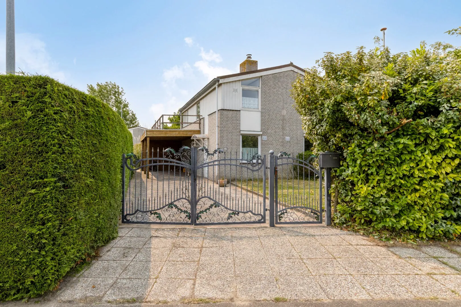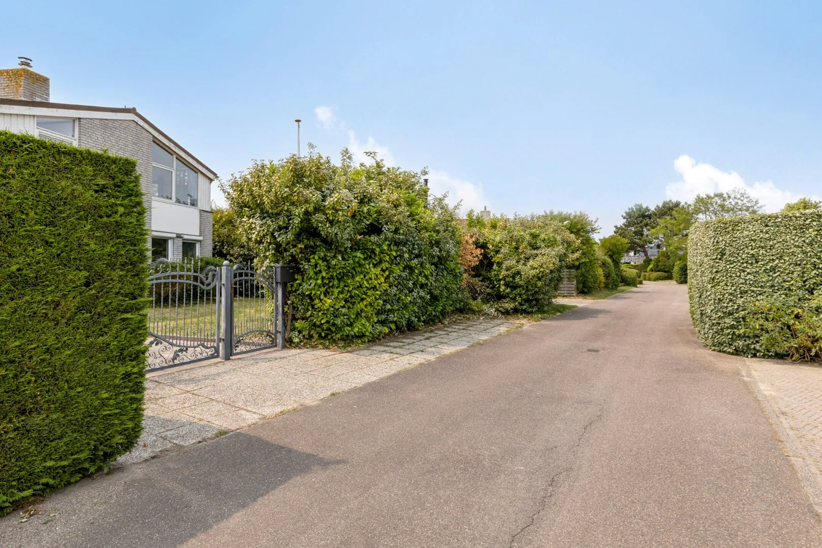 Het perceel is geheel omheind met groen en heeft een afgesloten oprit voor 2 auto’s.