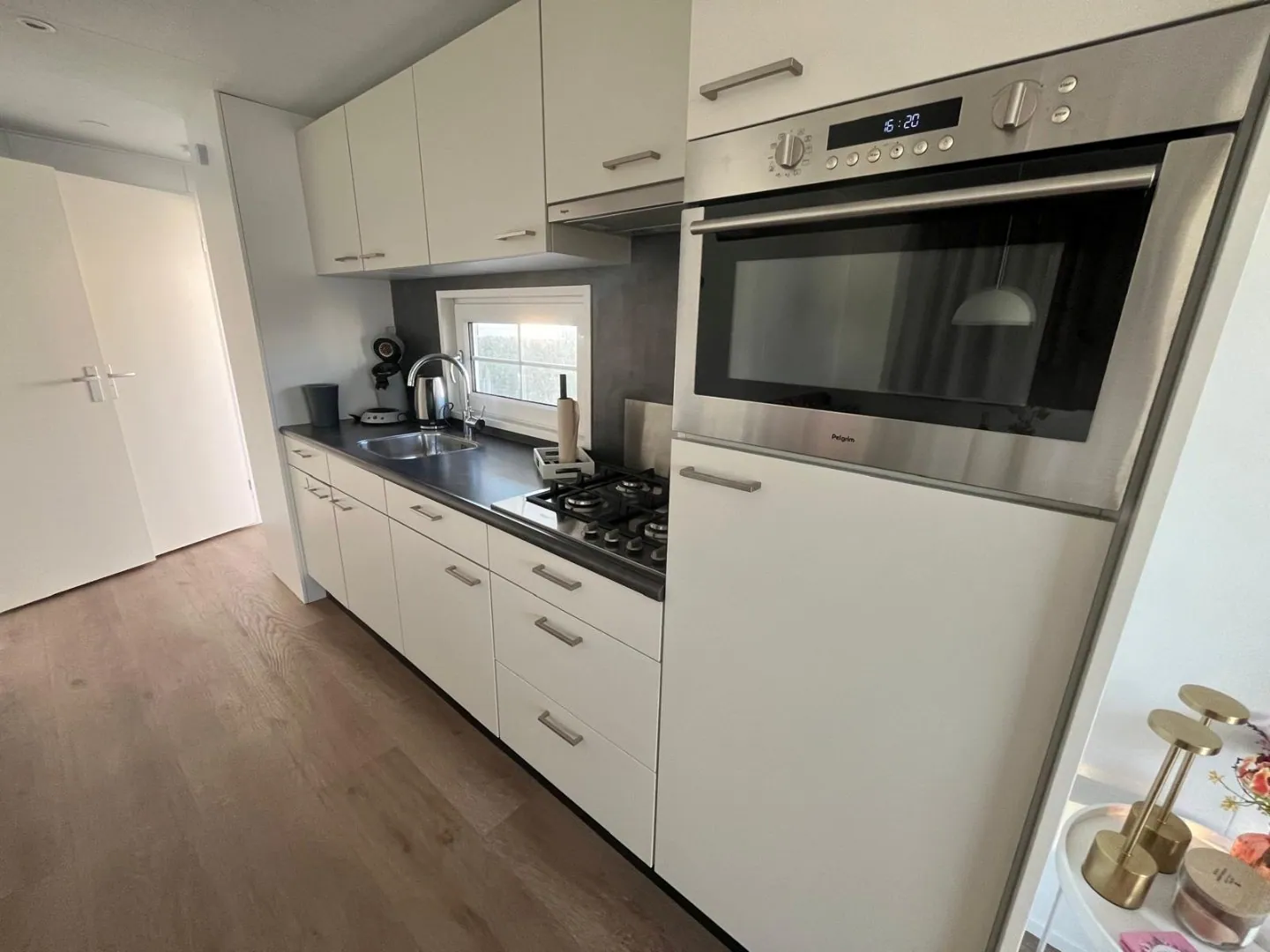 Complete keuken voorzien van o.a. 4-pits gaskookplaat, afzuigkap, koelkast en combimagnetron.