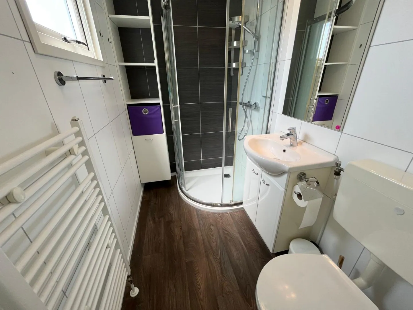 Moderne badkamer met toilet, douchecabine, wastafelmeubel, hoge kast en designradiator.