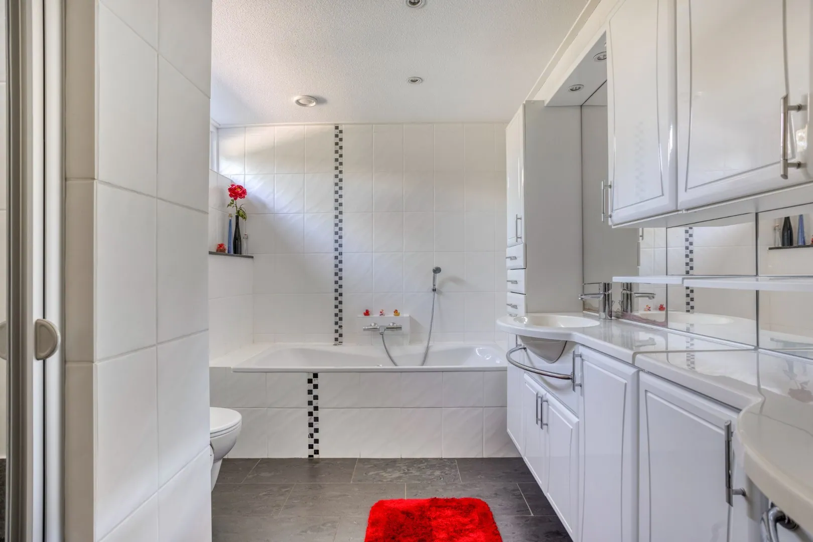 Deze lichte badkamer is voorzien van een 2e toilet (hangcloset), extra ruime douchecabine, dubbele wastafelmeubel en ligbad.